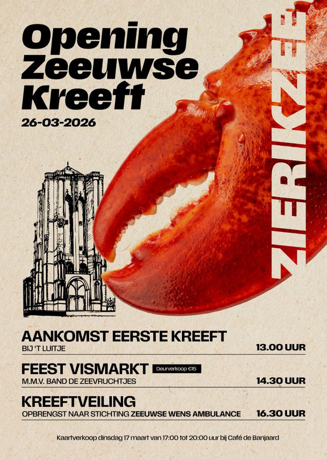 Op donderdag 26 maart arriveert de eerste Zeeuwse kreeft van het seizoen per historische stoomboot in Zierikzee. De Dockyard III meert om 13.00 uur af bij 't Luitje, waar Kreeftenkoningin en oud-kreeftenvisser Sam Uil van boord stappen met de kreeft in de hand. Aan de kade overhandigen zij de kreeft aan burgemeester Jack van der Hoek, die daarmee het kreeftenseizoen 2026 officieel opent. Champagne, een kreeftenlied en een groot publiek op de kade maken de opening tot een echt volksfeest. Daarna vertrekt een stoet met paard en wagen door de Zierikzeese binnenstad richting de Vismarkt. Wolfert Jumelet speelt live vanop de wagen. De kookclub rijdt mee — met de kreeft als eregalant. Op Sint Jacobshofje wacht het veilingfeest. Veilingmeester John Hage — bekend van het ringsteken in Ouwerkerk — neemt het podium over. De opbrengst van de veiling gaat dit jaar naar de Stichting Zeeuwse WensAmbulance. Kookclub 'Klein krootje, lekker eten' verzorgt kreeft-amuses en kookt de geveilde kreeft voor de hoogste bieder. De Vismarkt is gratis toegankelijk vanaf 14.00 uur. De veiling start omstreeks 16.15 uur. Entreekaarten kosten €15,- per persoon, inclusief twee consumpties en hapjes. Voorverkoop op m